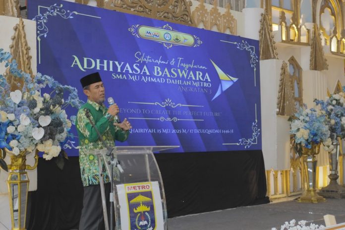 METRO-Bertempat di Wisma Haji Kota Metro, 15 Mei 2025, pada acara Silaturahmi dan Pelepasan Siswa Kelas XII “Adiyasa Baswara” SMA Muhammadiyah Ahmad Dahlan (MuAD) Metro. Ketua Pimpinan Daerah Muhammadiyah (PDM) Kota Metro, Kustono, S.Ag., hadir memberikan sambutan sekaligus memberikan tausyiah pesan-pesan penting kepada para siswa dan orang tua.