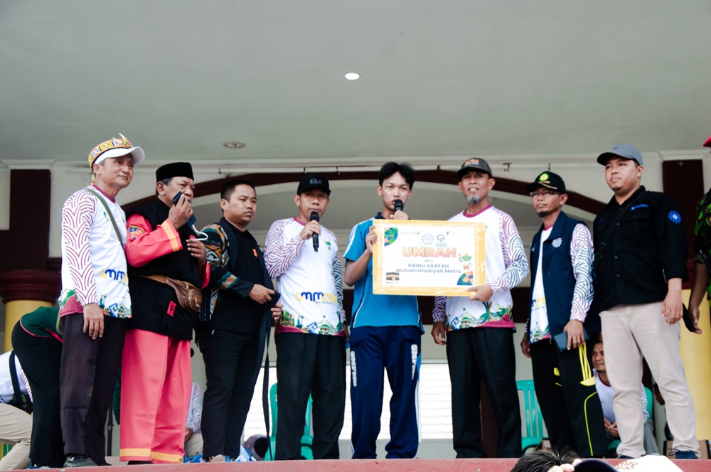 METRO-Muhammad Rabil Haqi, siswa kelas IX SMP Muhammadiyah Ahmad Dahlan Metro, menerima doorpize utama umrah pada peringatan Milad Muhammadiyah ke-113 di Lapangan Samber Park Kota Metro, Jumat (28/11/2025).