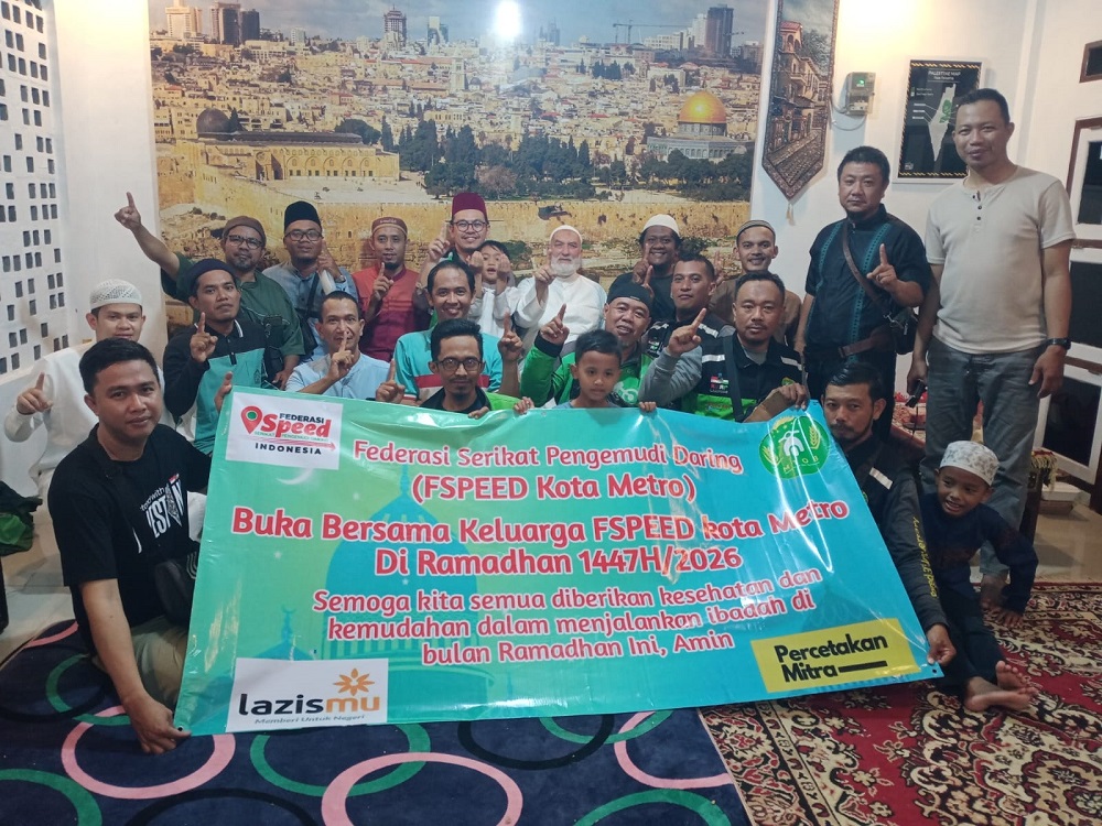 METRO – Suasana hangat tampak di kediaman Ustadz Romadhan di Iringmulyo, Metro Timur, pada Senin (23/2/2026). Sebanyak 45 pengemudi daring yang tergabung dalam Serikat Pengemudi Daring (Speed) Kota Metro berkumpul untuk mengikuti agenda Kajian Islam dan Buka Puasa Bersama yang didukung oleh Lazismu Kota Metro.