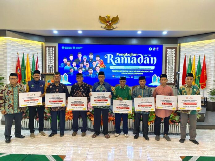 Lampung – Lembaga Amil Zakat, Infak, dan Sedekah Muhammadiyah (LazisMU) Lampung, menyalurkan sejumlah program sosial, dalam menyambut bulan suci Ramadhan 1447H, penyaluran dilakukan secara simbolis, pada acara pengkajian Ramadhan PWM Lampung, kepada penerima manfaat, berlangsung di Auditorium SMP Muhammadiyah Ahmad Dahlan Metro pada Sabtu,7/3/2026.