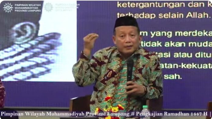METRO-Pengkajian Ramadhan yang diselenggarakan Pimpinan Wilayah Muhammadiyah (PWM) Lampung menghadirkan Dr. Ma’ruf Abidin sebagai pemateri yang menegaskan bahwa tauhid dan keyakinan kepada pertolongan Allah menjadi fondasi utama dalam setiap perjuangan dakwah dan pembangunan amal usaha Muhammadiyah. Kegiatan tersebut berlangsung di Auditorium SMP Muhammadiyah Ahmad Dahlan (SMPMuAD) Metro, Sabtu,7/3/2026.