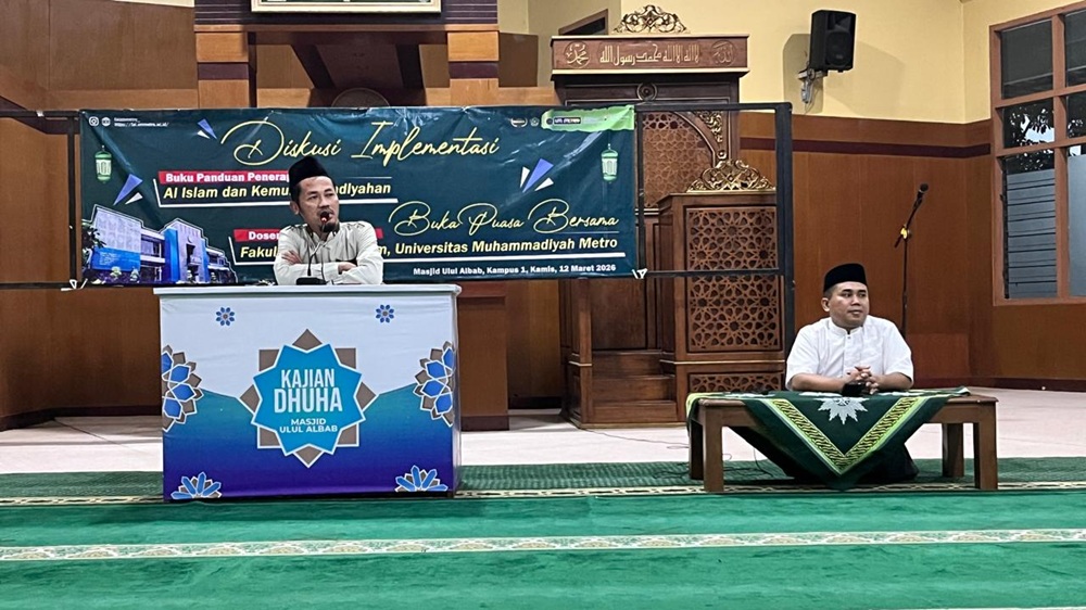 METRO-Fakultas Agama Islam (FAI) Universitas Muhammadiyah Metro menggelar diskusi implementasi Buku Panduan Penerapan Al-Islam dan Kemuhammadiyahan (AIK) yang dirangkaikan dengan buka puasa bersama dosen dan mahasiswa. Kegiatan tersebut berlangsung di Masjid Ulul Albab, kampus 1 UM Metro pada Kamis, 12 Maret 2026.